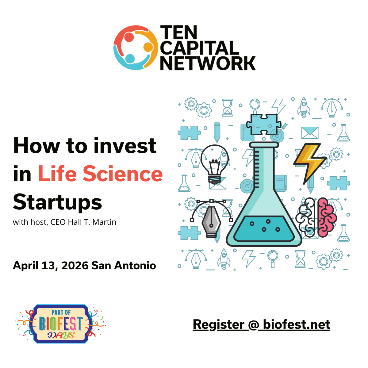 Biofest Days Event BioMedSA Event Rosenberg Skyroom 847 E. Hildebrand, San Antonio, United StatesJoin Us for Biofest Invest 2026! Biofest Invest is a premier spring event connecting Texas bioscience companies with investors from across the nation. This day-long event features expert speakers, insightful panels, and networking opportunities with organizations that support bioscience entrepreneurs. Selected companies will present their pitch decks to investors, fostering valuable connections both in-person and ... Read more